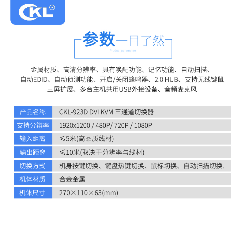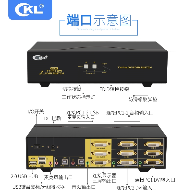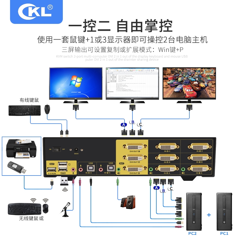CKL KVM three-screen expansion switcher three-channel 2-in 1-out 6-in 3-out DVI digital signal three-channel keyboard mouse HUB sharer CKL-923D