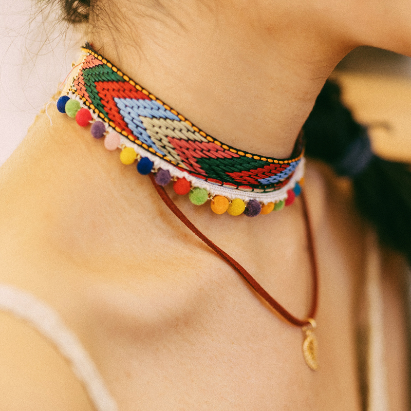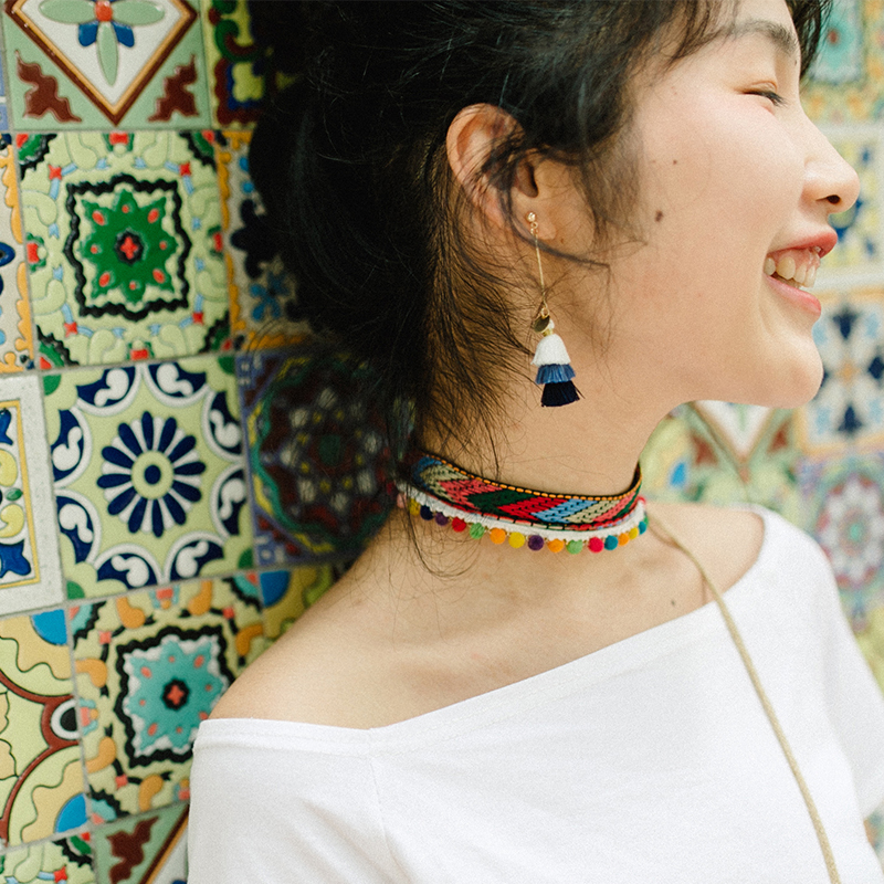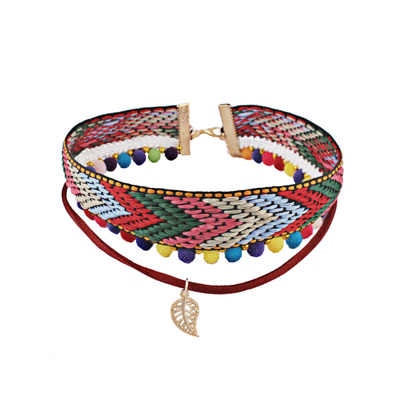 Bohemian Short Money Chain Ethnic Wind Lock Bone Chain Colored Weave Neckline Embroidered Hair Ball Fluke Pendant