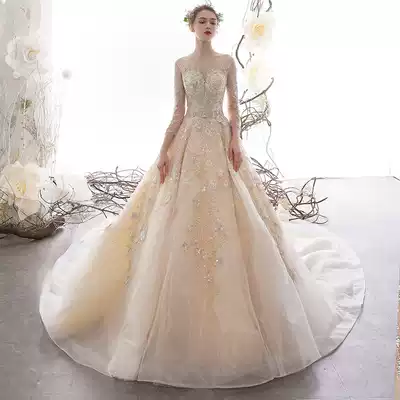 "Summer Flower" 2021 New Wedding Bride long sleeve Starry Sky tail cover arm thin heavy industry simple champagne color