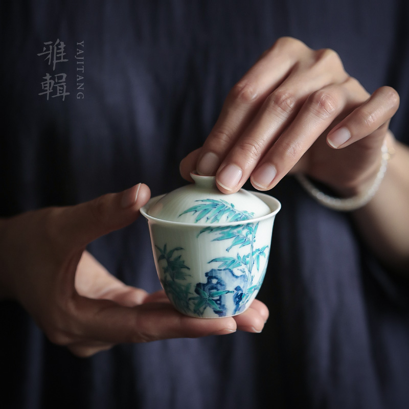 Yaidang Qingfeng Xu came to the full handmade bamboo grain small cover bowl Gongfu tea with green flower fighting color