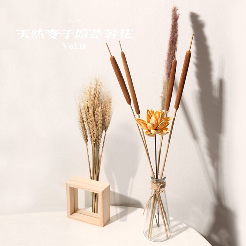 A bunch of wheat a reed crop of a bundle of 100 band rods of white cotton 1 bush 5 gold balls dry flowers 1 piece of dry flowers of Orchid dry flowers 1 white violet dry flowers 1 piece of eternal Eugali dry flowers