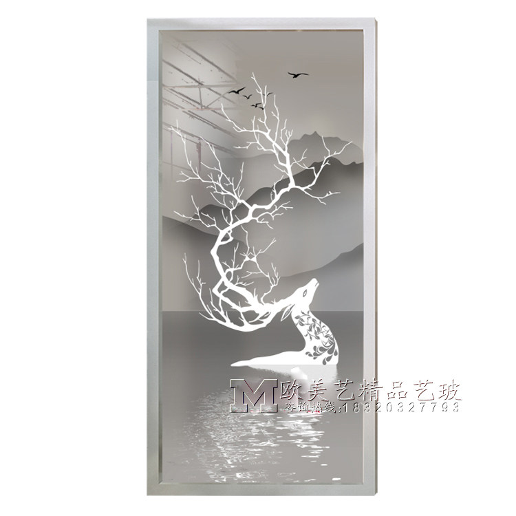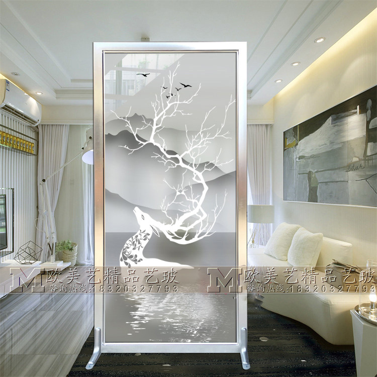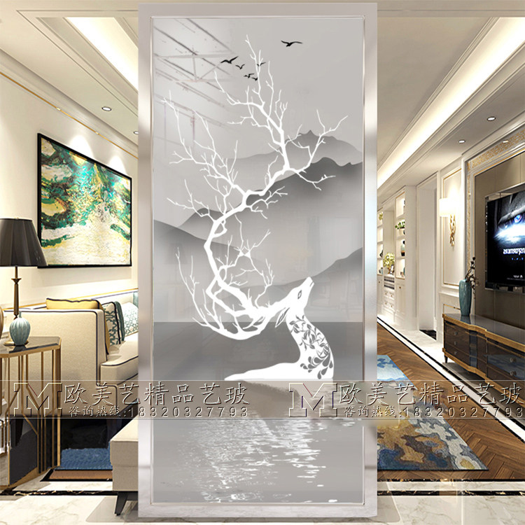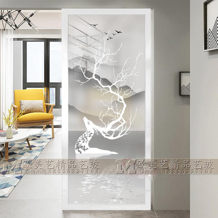 Art glass partition living room mobile screen Dry and wet area Entry lucky deer background wall double-sided translucent entrance cabinet