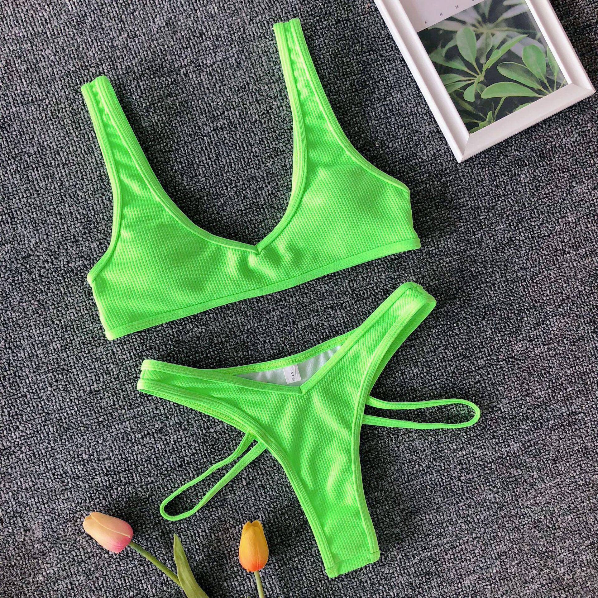 European beauty two-piece swimsuit solid color sexy bandage bikini fluorescent high fork beach swimsuit two-piece bikini