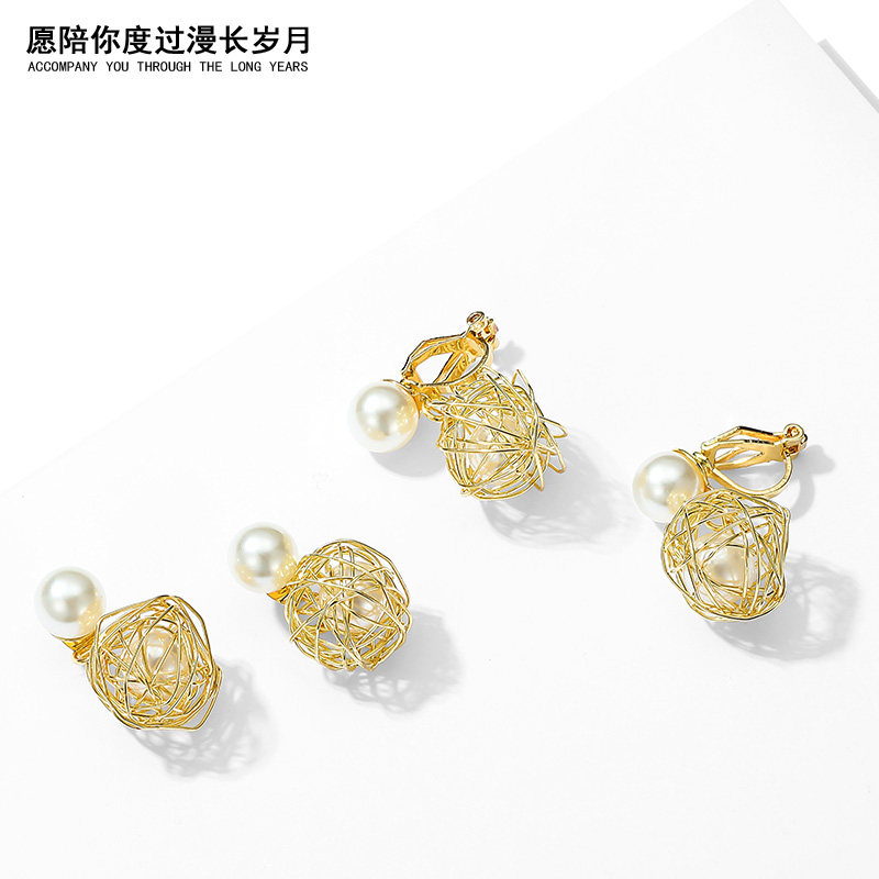 (Ear Clip) Hollowed-out Metal Ball Pearl Ear Clip (Silver Pin) Hollowed-out Metal Ball Pearl Earrings