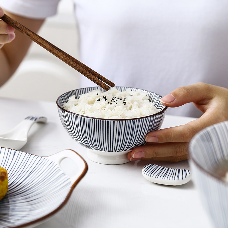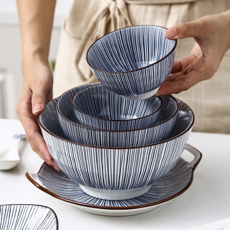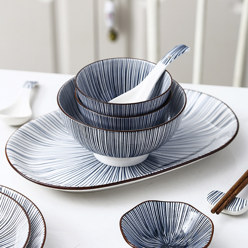 8-inch rice plate with blue stripes, 7-inch rice plate with blue stripes, 9-inch large ramen bowl, sushi plate with blue stripes, flower-shaped plate with blue stripes, no blue stripes, 12-inch fish plate, chopstick rest with blue stripes, no single shot