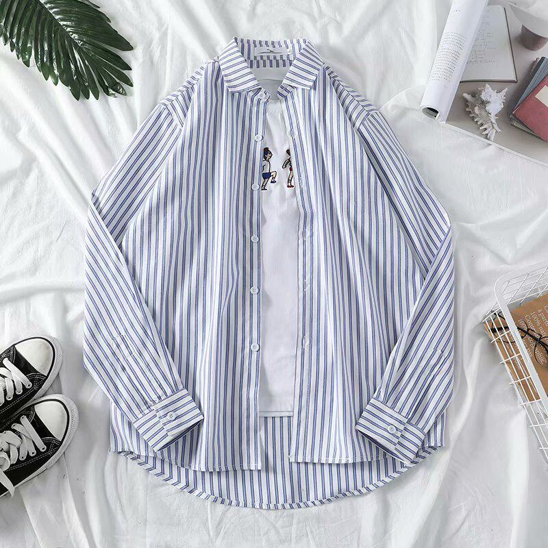 Spring and summer Port wind casual loose long-sleeved striped pure Pe ア ア ア shirt male youth Korean version of the trend student shirt
