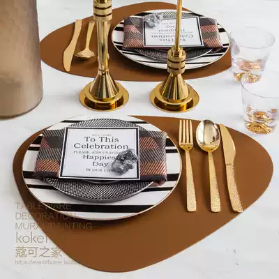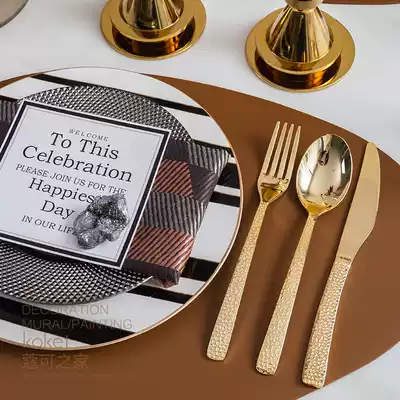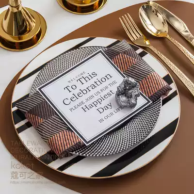 Dining table set 0386 Brown special-shaped placemats (real price) black and white striped large plate silver bowl small plate (real price) geometric pattern napkin (real price) Golden Hammer point knife and fork more three-piece set (special price) Chanel