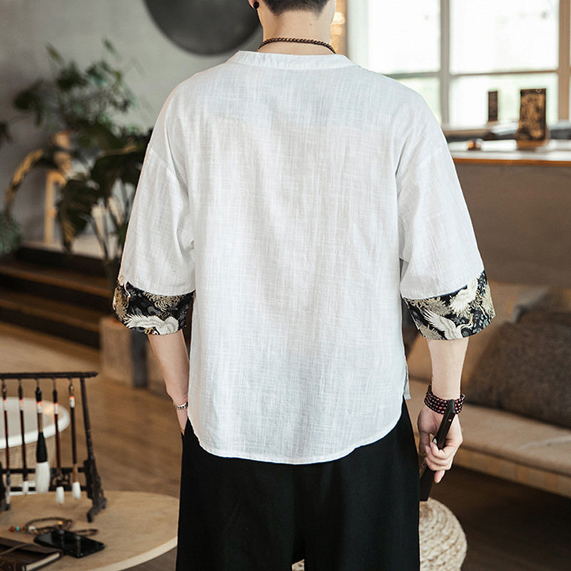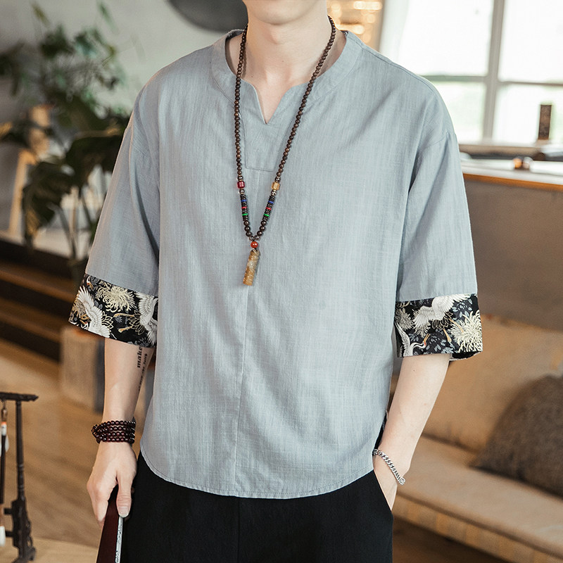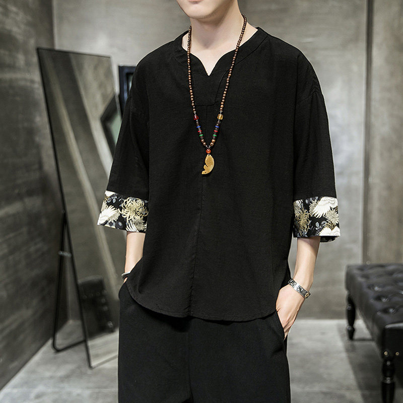 Chinese V-collar Seven-Knife T-Shirt Men Fan Tea Clothes Retro Chinese Style Shirt Semi-Sleeve Sleeve
