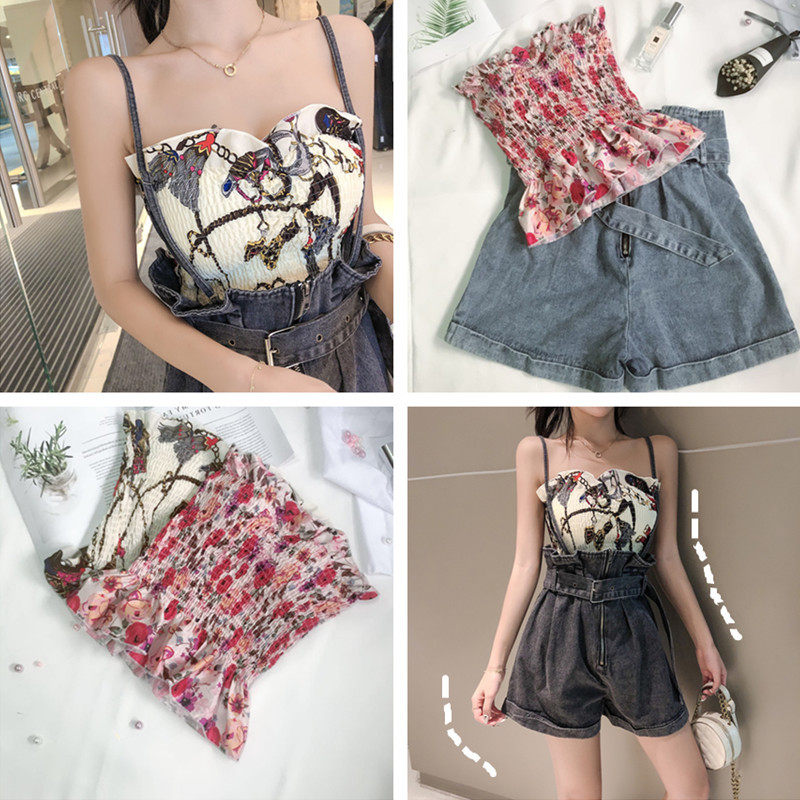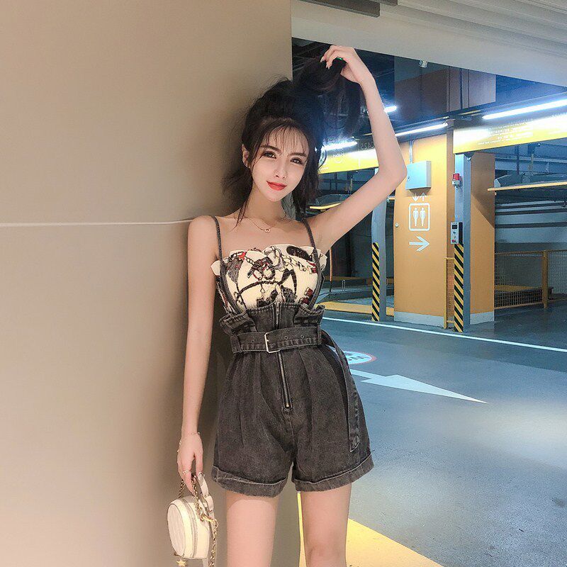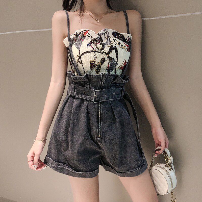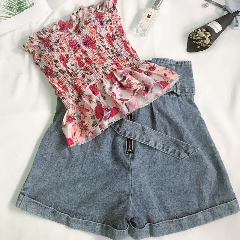 2022 New Summer Clothing Mesh Red Color Smear Matching Denim Cuddling Bag Shorts Fashion Suit 100 lap two sets of women