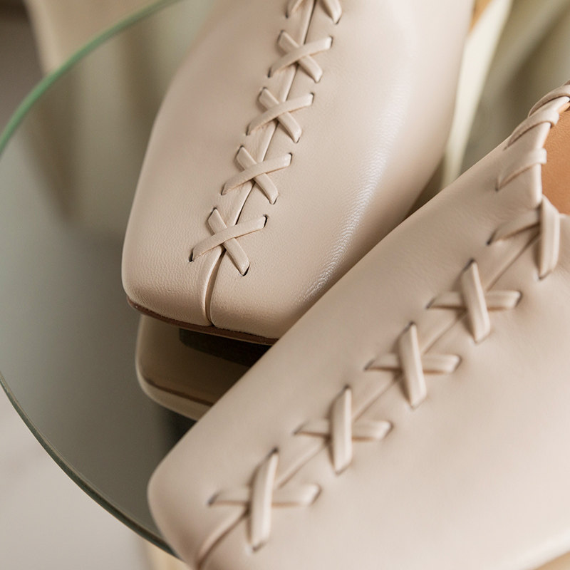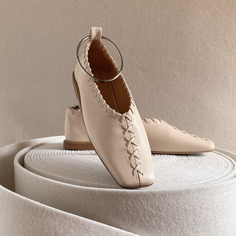 RoseLingLing fashionable ring braided belt square toe lambskin comfortable and good to wear flat shoes grandma shoes