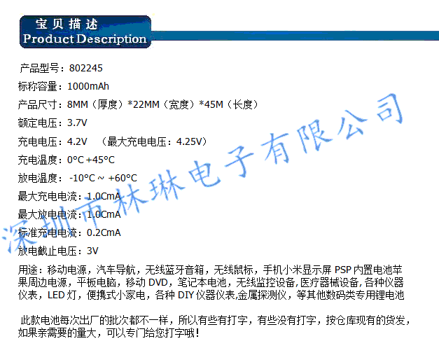 3 7v polymer lithium battery 802245 voice recorder DIY built-in rechargeable battery 1000 mAh 082245