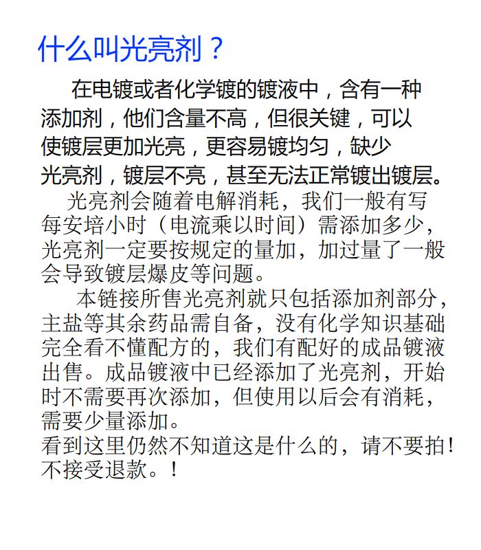 Brightener softener Each 60ml Low foam humectant 120ml Displacement agent 120ml Brightener 5L softener 5L Semi-gloss nickel additive 120ml