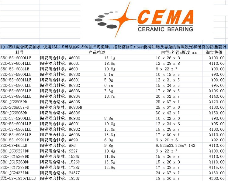 6000 ceramic 10x26x8 mm6001 ceramic 12x28x8 mm608 ceramic 8x22x7 mm6800 ceramic 10x19x5 mm6801 ceramic 12x21x5 mm6802 ceramic 15x24x5 mm6803 ceramic 17x26x5 mm6804 ceramic 20x32x7 mm6805 ceramic 25x37x7 mm6805Z-N ceramic 25x37x6 mm6806 mm6806 ceramic 30x42x7 mm6900 ceramic 10x22x6 mm6901 ceramic 12x24x6 mm6902 ceramic 15x28x7 mm6903 ceramic 17x30x7 mm699 ceramic 9x20x6 mm9227 ceramic 9x22x7 mm15267 ceramic 15x26x7 mm15268 ceramic 15x26x8 mm17287 ceramic 17x28x7 mm24377 ceramic 24x37x7 mm18307 ceramic 18x30x7 mm6806 SC ceramic stainless steel 30x42x7 mm6801 ceramic 50x65x7 mm