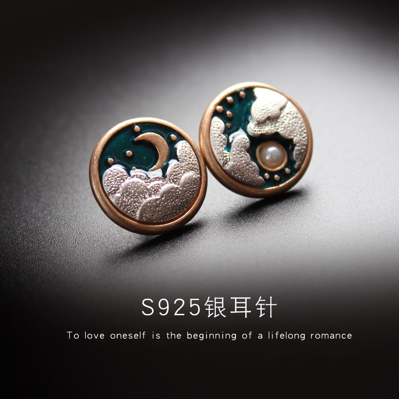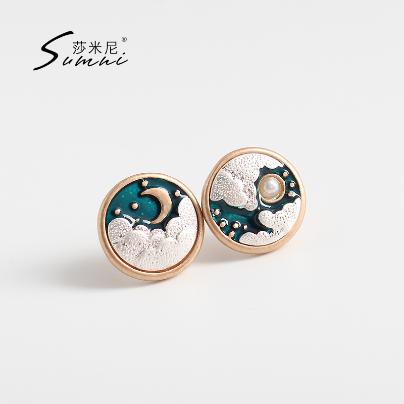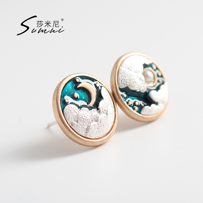 sumni Samini Yunkai Sun Moon 925 Silver Enamel Color Glaze Ear Acupuncture Female Chinese Style Asymmetric Personality Temperament
