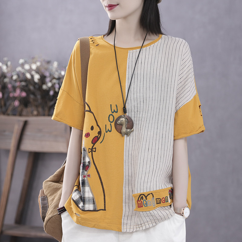 Han Soyi Retro Art Summer 2022 New Cotton Linen Stripe Splicing Blouse Thin size Large size loose T-shirt woman