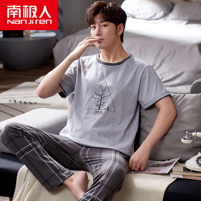 Antarctic men's pajamas summer pure cotton short-sleeved trousers thin summer cotton large size men's home wear suit