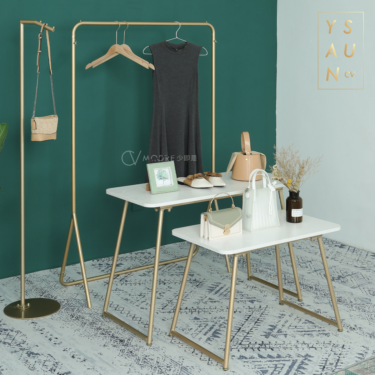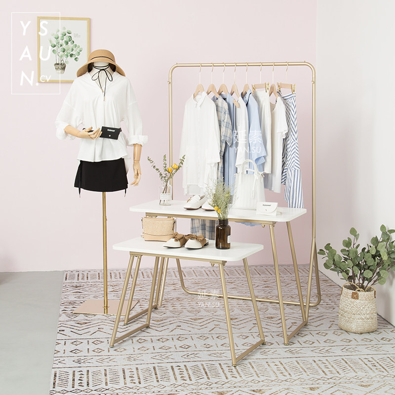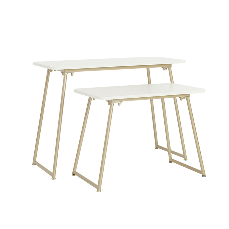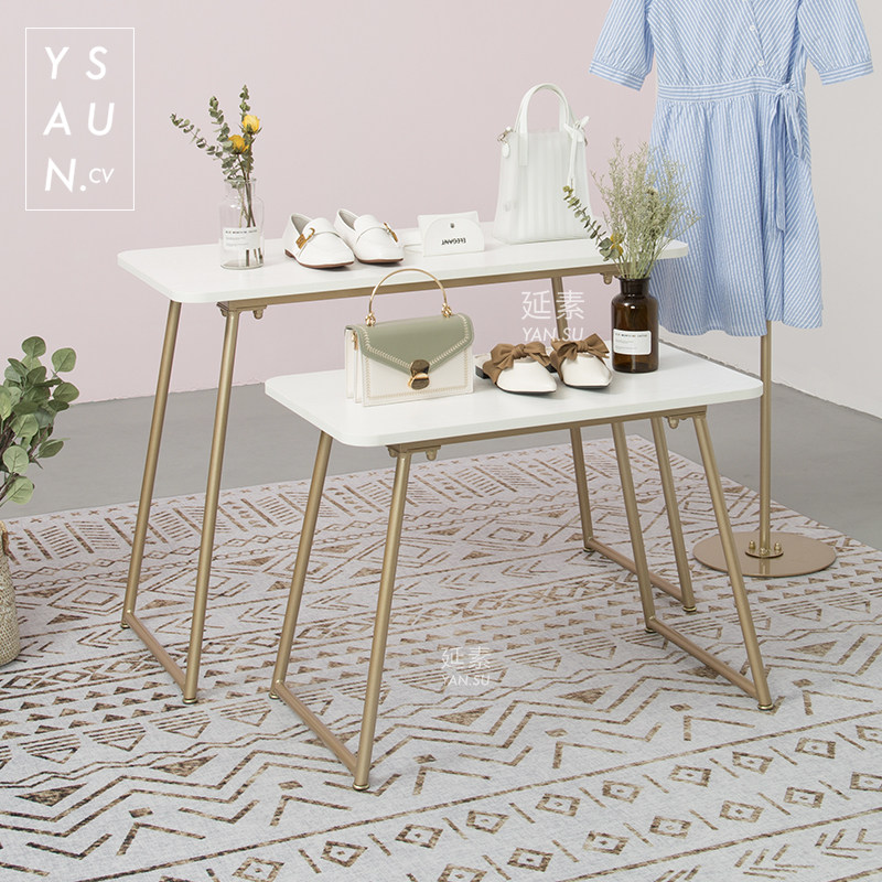 Length 100 Wide 45 high 70 (large)Length 75 wide 45 high 55 (small)Size combination table set Gold head thick linen wood color hand gold bottom set table floor stand Set table floor stand