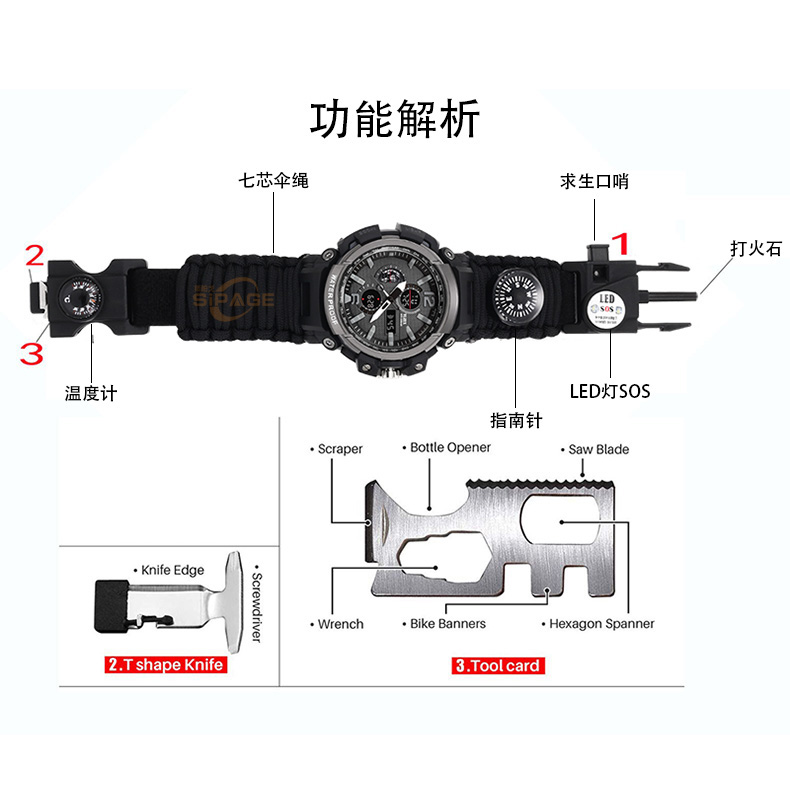 Outdoor military fan watch LED light SOS Flintstone compass Military watch multi-function seven-core umbrella rope life-saving hand chain men