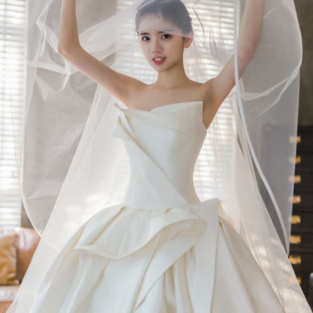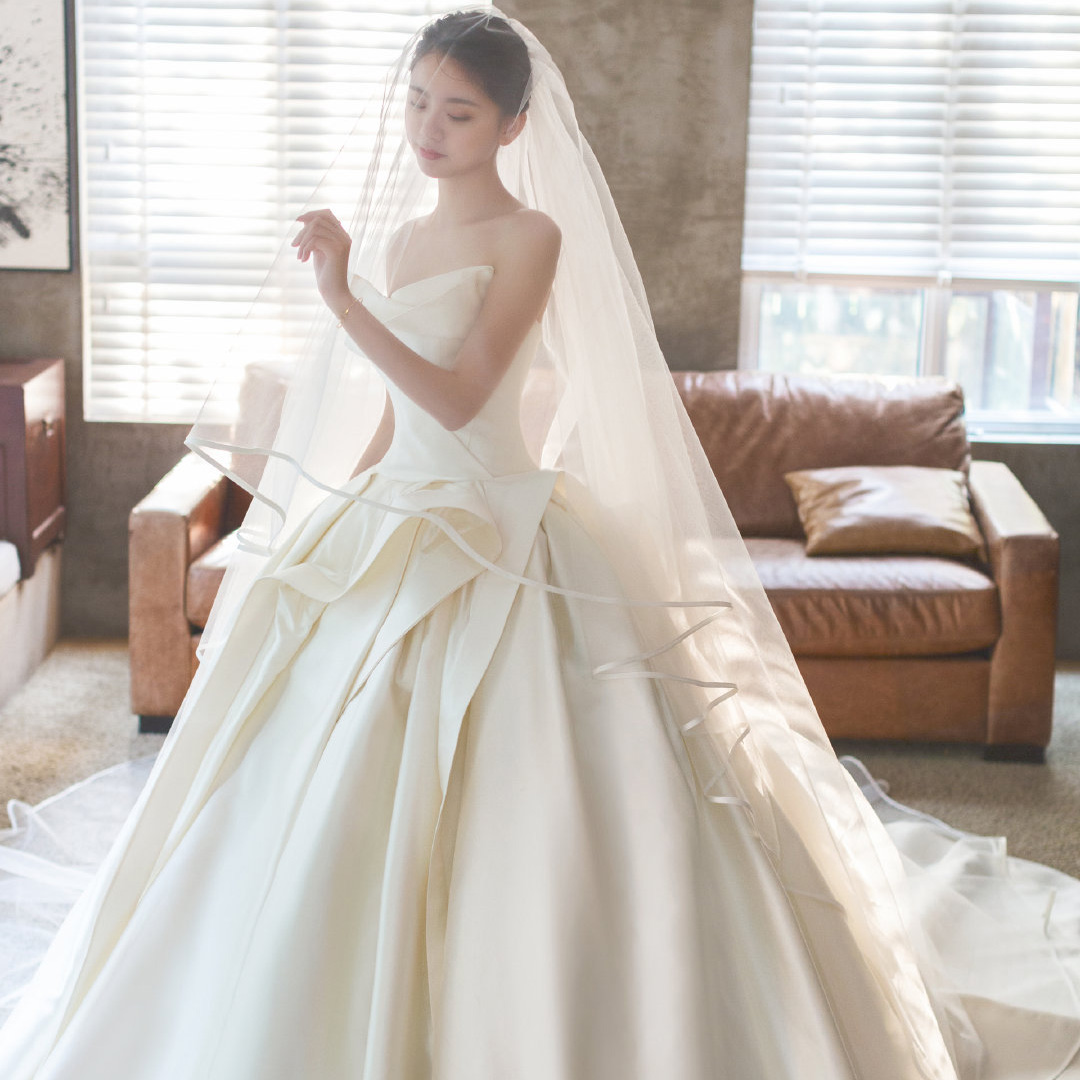 Big tailed satin main wedding dress 2021 new bridal court retro Hepburn chest pumpy dress luxury