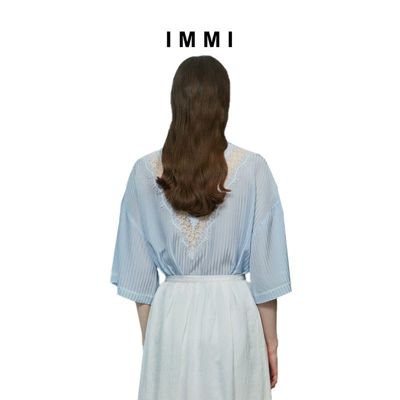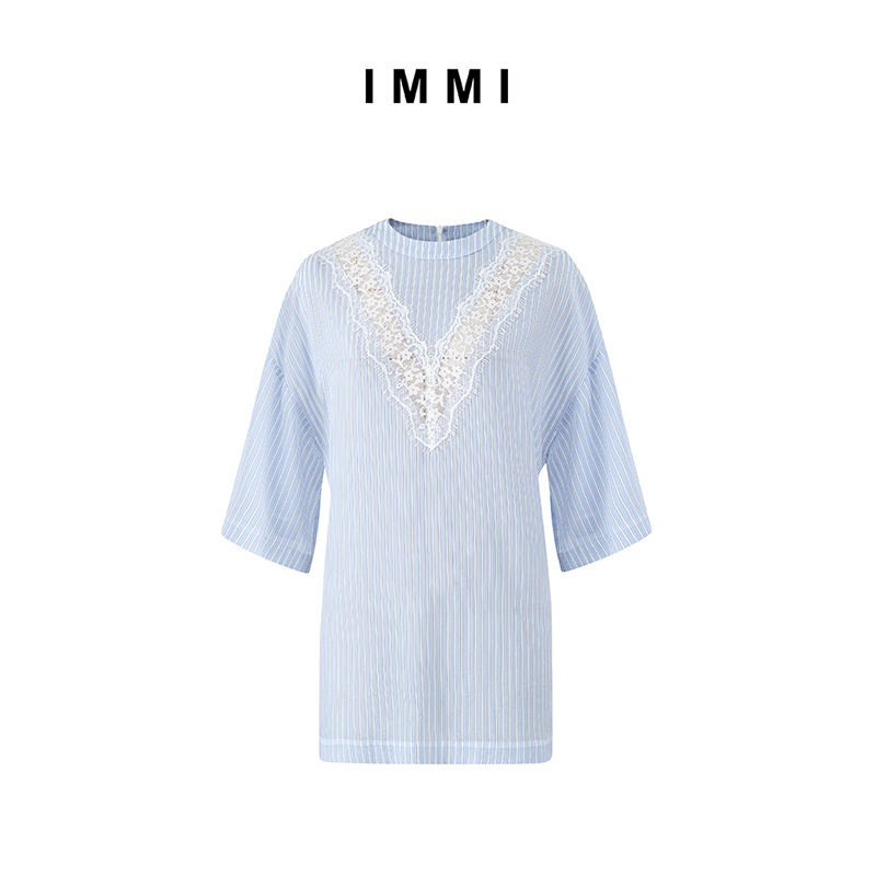 (designer brand IMMI) fresh blue striped copper ammonia splicing lace short sleeve 191TP035X