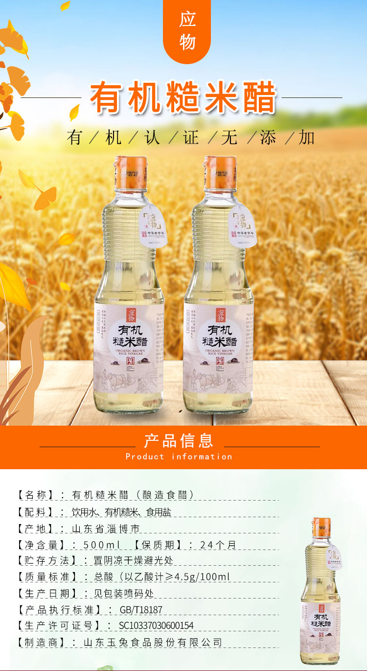 Organic Brown Rice Vinegar 500ml Brewed Vinegar Organic Condiment Yutu Shoulder Seasoning Rainbow Rain