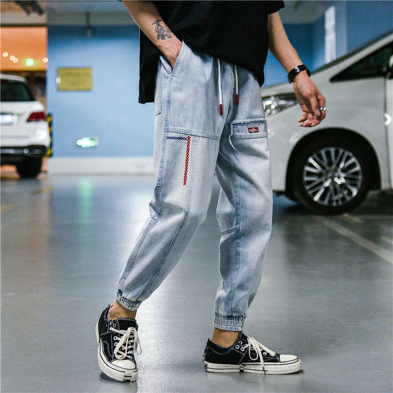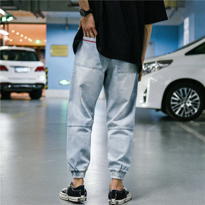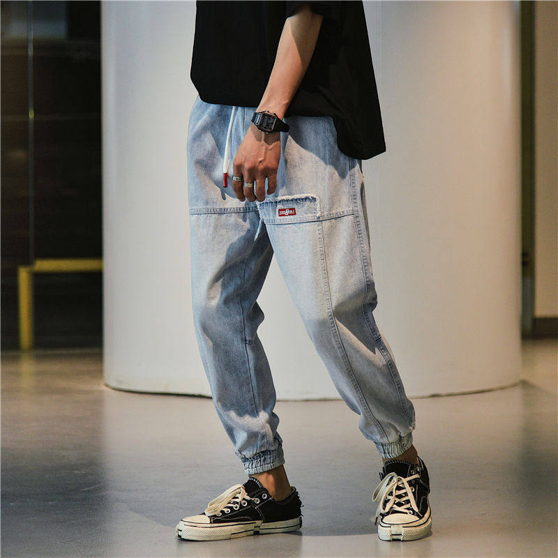 Fashion brand tie-up jeans Men's loose wide-leg Harun trousers Korean version of the trend nine-point pants joker ins overalls