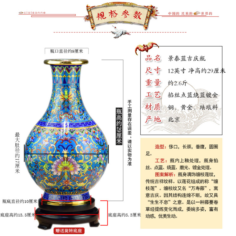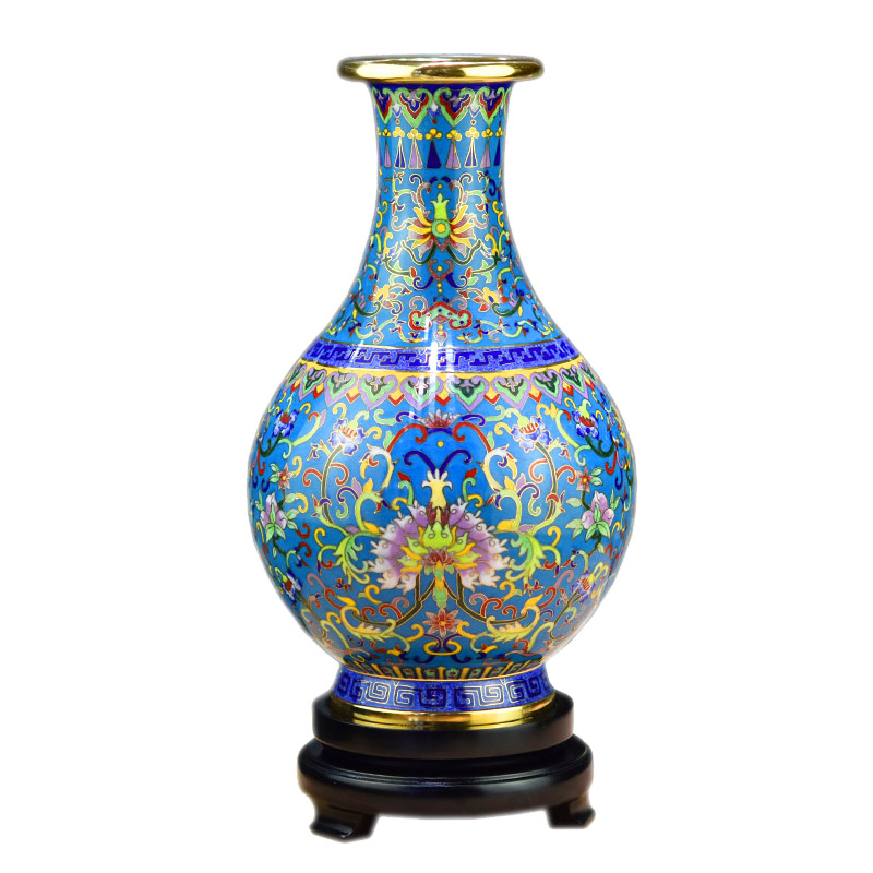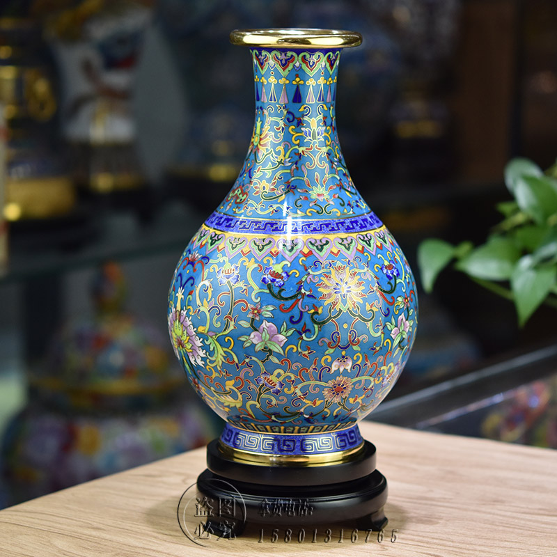 Old Beijing features handicraft Tai Blue Vase 12 inches Jiqing bottle All copper pinching silk enamel ga - suu office gift