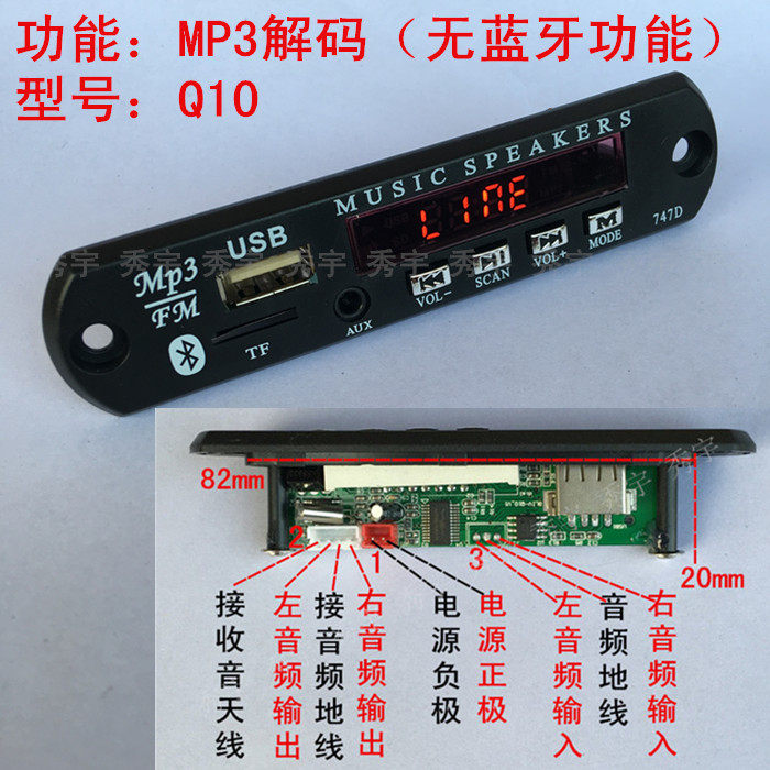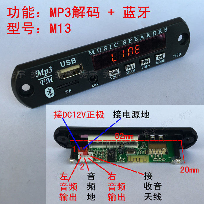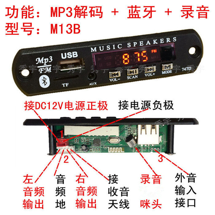 747D 12V MP3 decoder board FM display USB audio board card reader optional recording Bluetooth hands-free call