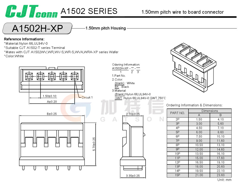 A1502H-3P pitch P= 1 5MM CJT Yangtze River connector original press line terminal rubber shell