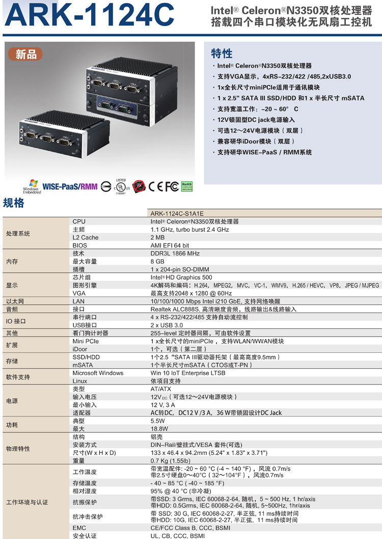ARK-1124C-S1A1E Advantech embedded host dual-core N3350 CPU 4 485 optional CAN network ports