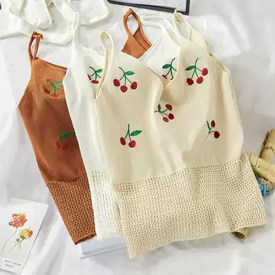 2021 spring new chic hipster V collar cute cherry embroidery hollow knit vest female 0847
