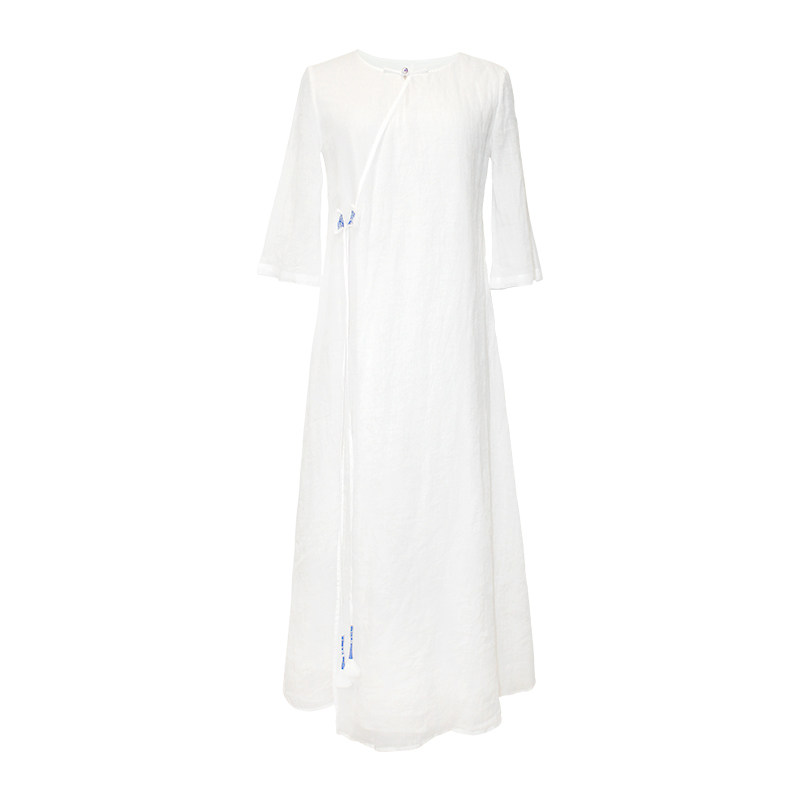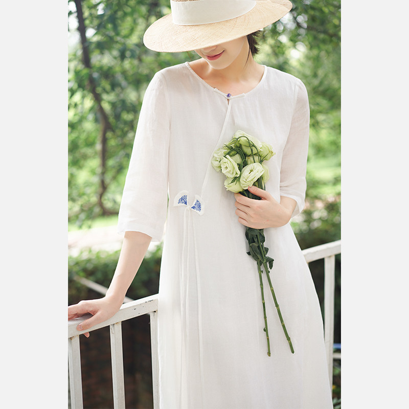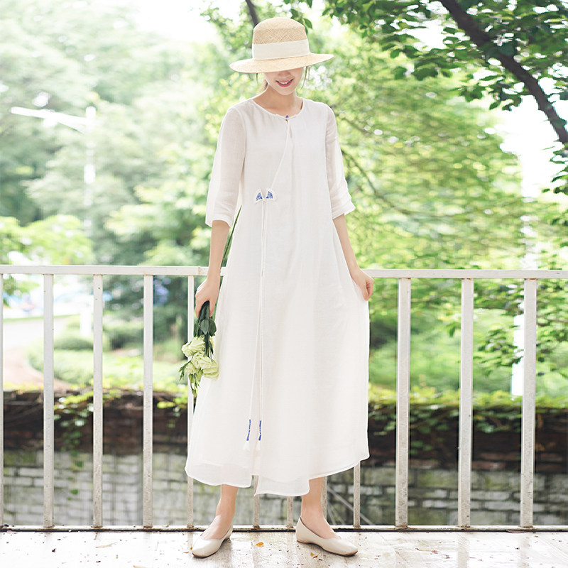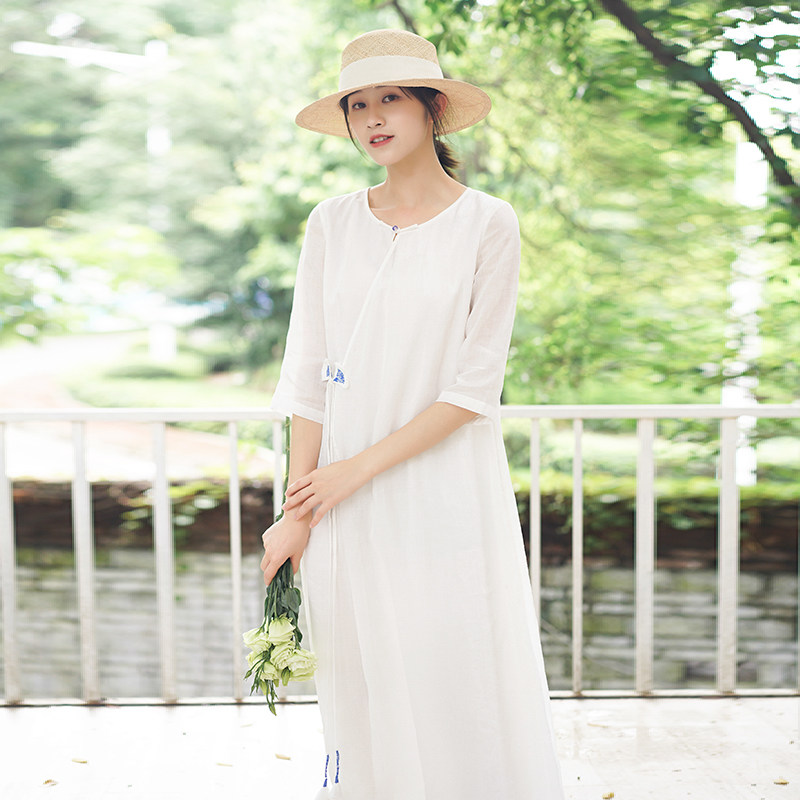 Early cicada original 2021 summer women's Chinese retro ethnic style white cotton and linen long version temperament loose dress