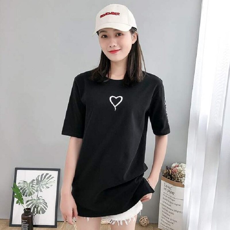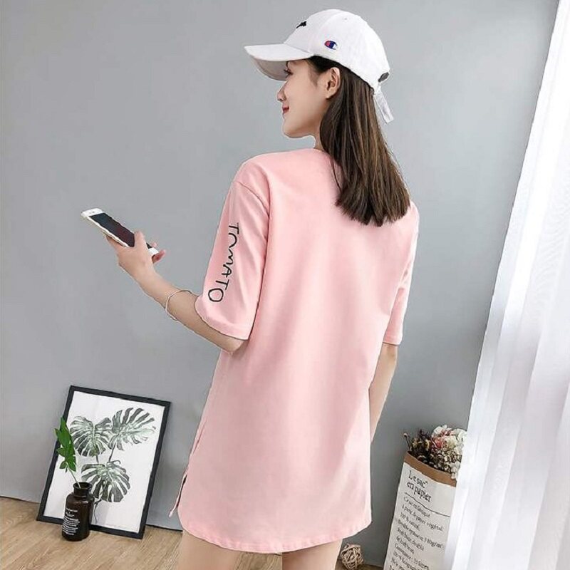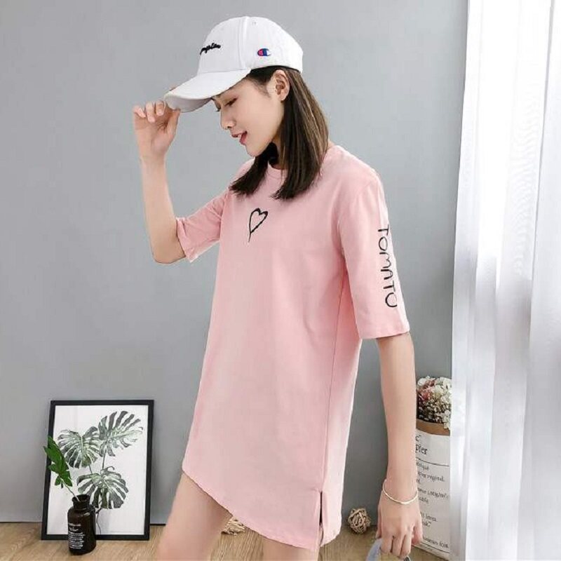 South Korea 2022 summer mid-length short-sleeved t-shirt female Korean version loose large size top slit round neck printed T-shirt tide