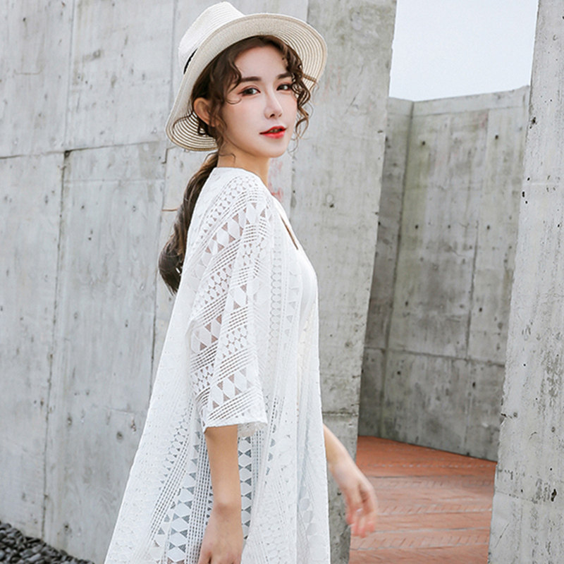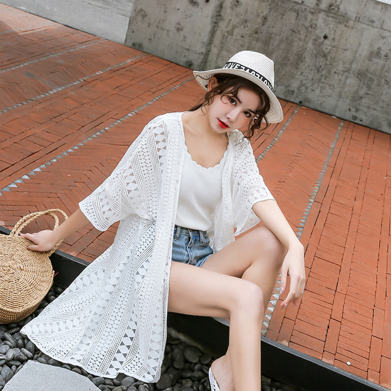 Summer 2022 New Korean version Loose Lace Hollowed-out Outside a thin cardiovert sunscreen for a long version of the shawl jacket