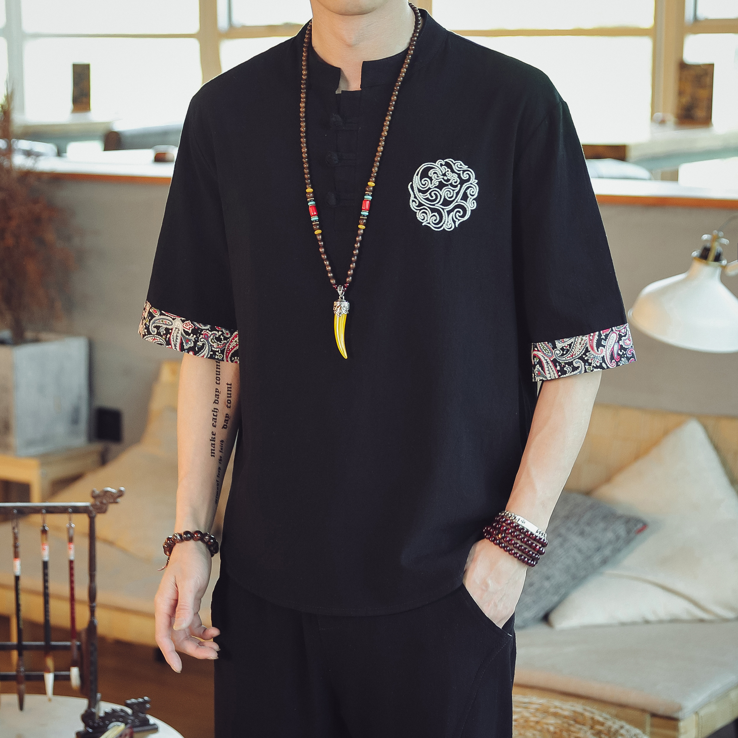 Chinese style men's linen short-sleeved men's Tang suit youth disc button cotton and linen T-shirt embroidery retro large size half-sleeve top