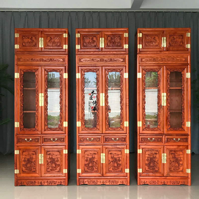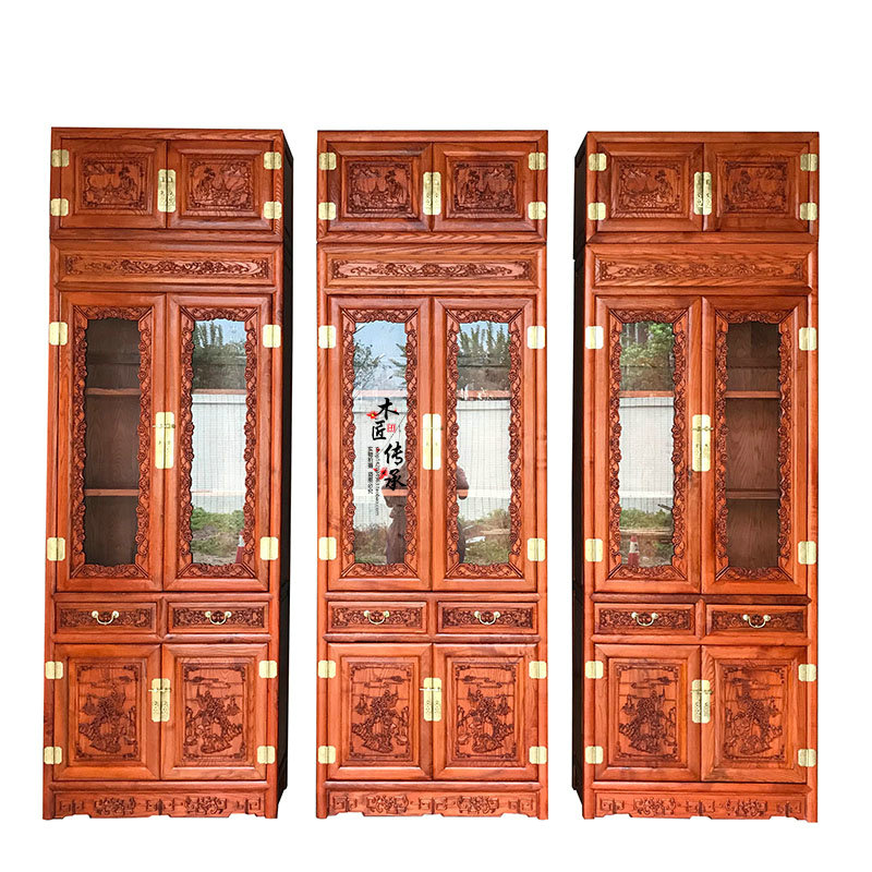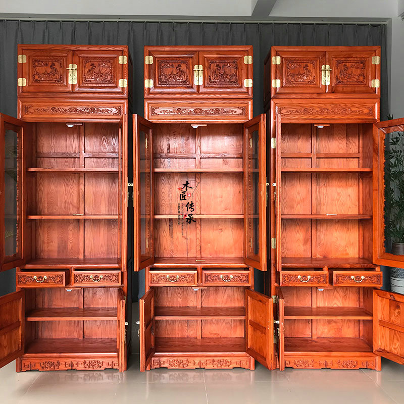 New Chinese Vintage Bookcase White Wax Wood Bookcase Log With Glass Bookcase Cabinet Top Case Cabinet Carved flower containing cabinet