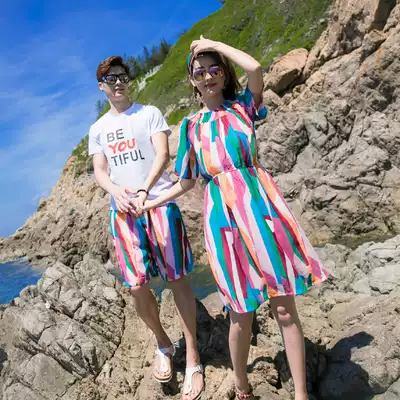 Beach Couple Dress Summer Dress Men and Women Large Size Short Sleeve Print T-shirt Women ankle-length pants Beach Pants Seaside Holiday Set