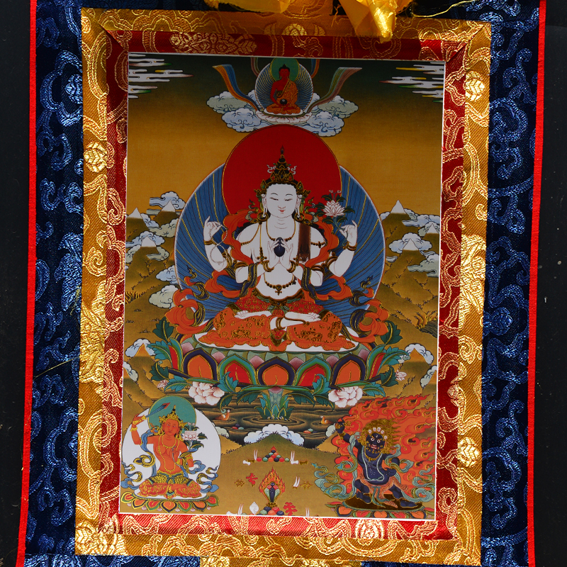 Four-arm Guanyin Tang card portrait Living room Xuanguan beautifully hand painted Tibetan style Buddha Statue hung with a small number 36cm