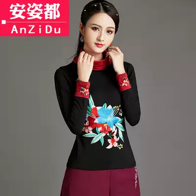Early autumn new women's clothing 2019 national style slim-fitting embroidered T-shirt women's long-sleeved large-size top winter turtleneck bottoming shirt