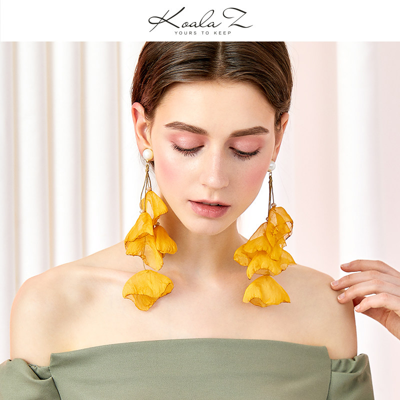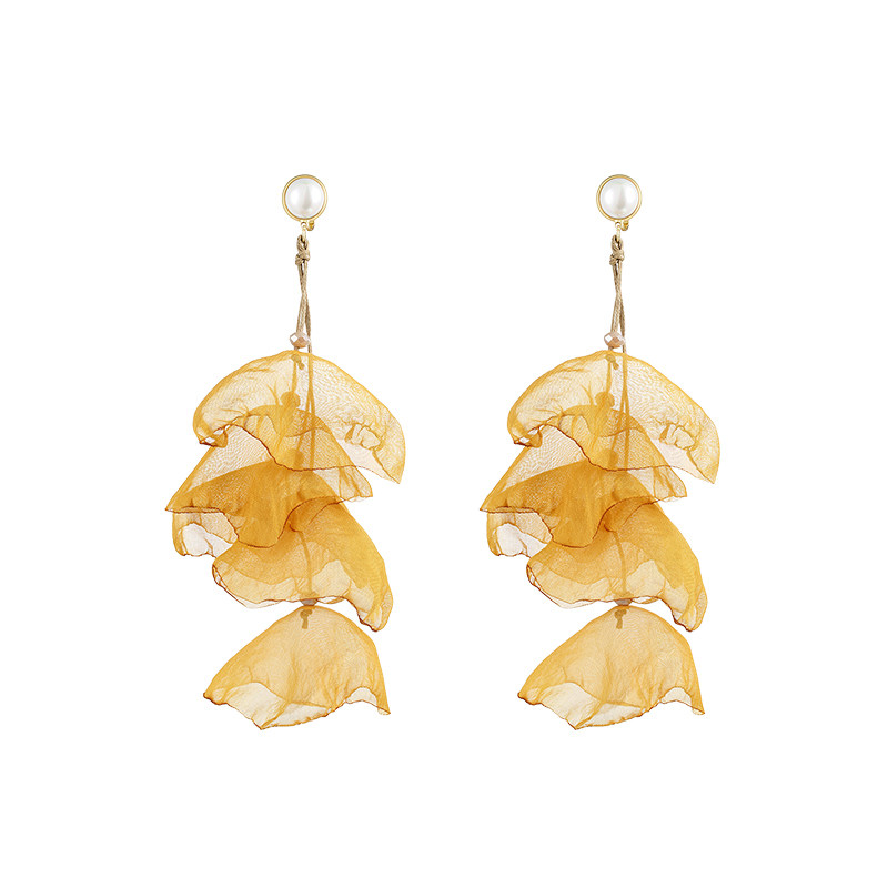 Imported Korean elegant fabric Summer fresh chiffon fabric flower long version tassel earrings ear clip no ear holes