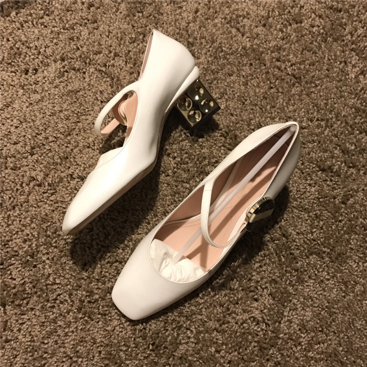 Women's shoes triangle heel buckle square toe off-white, very distinctive, good-looking, with a heel height of about 5cm