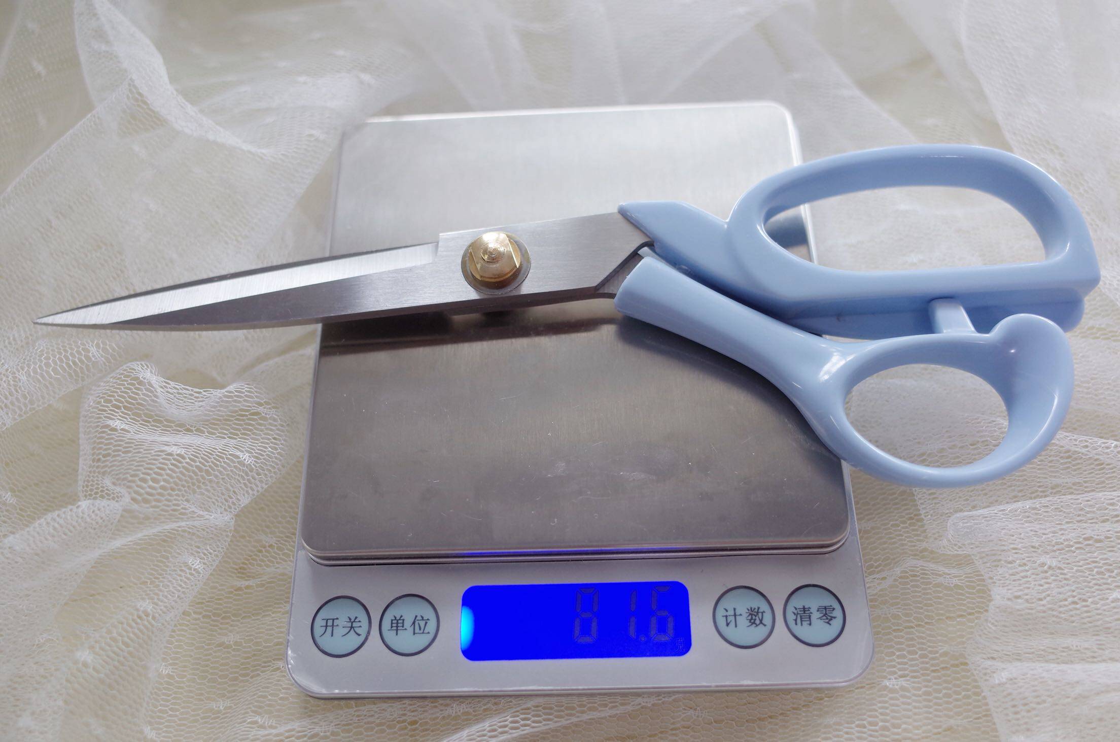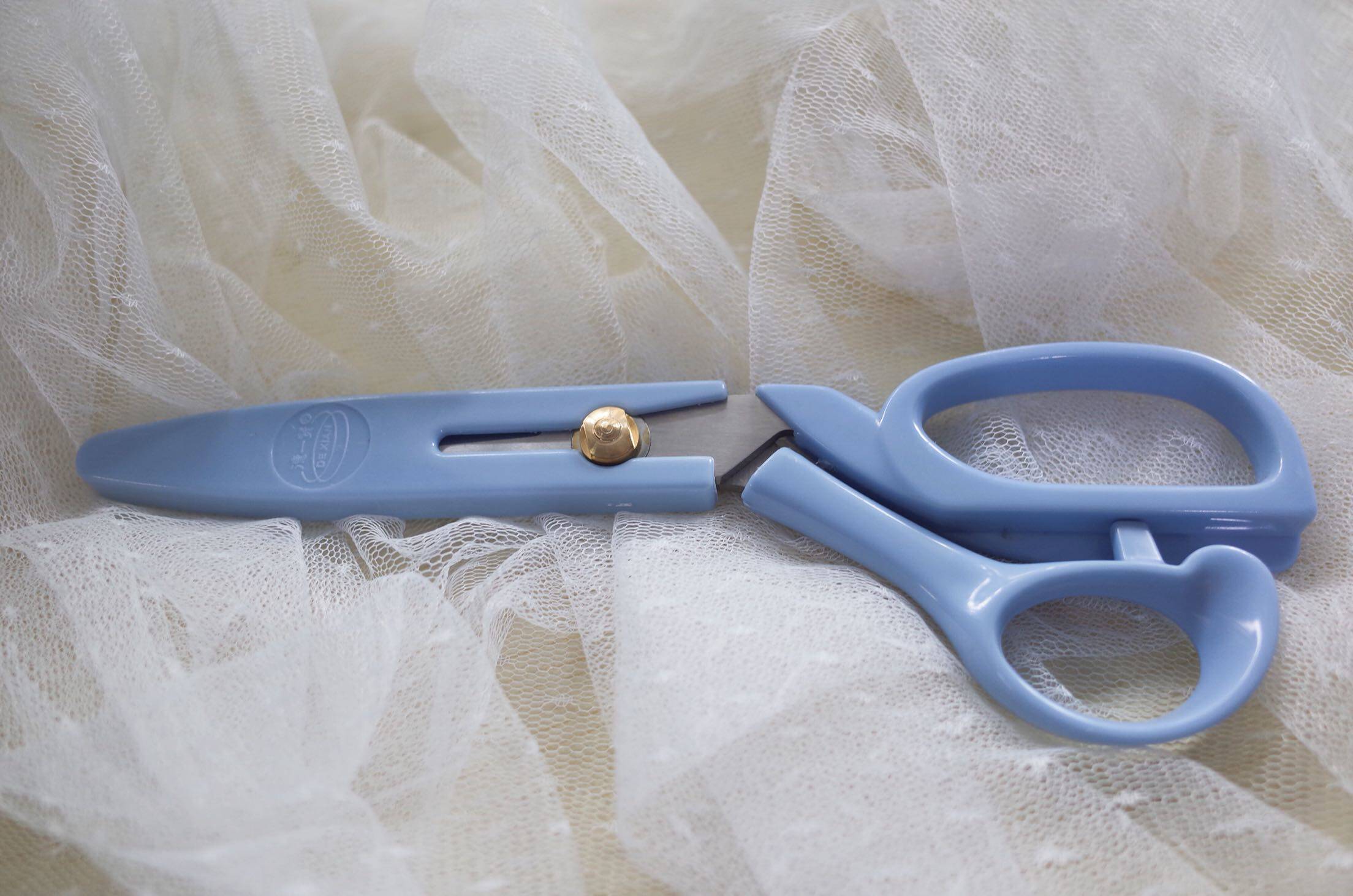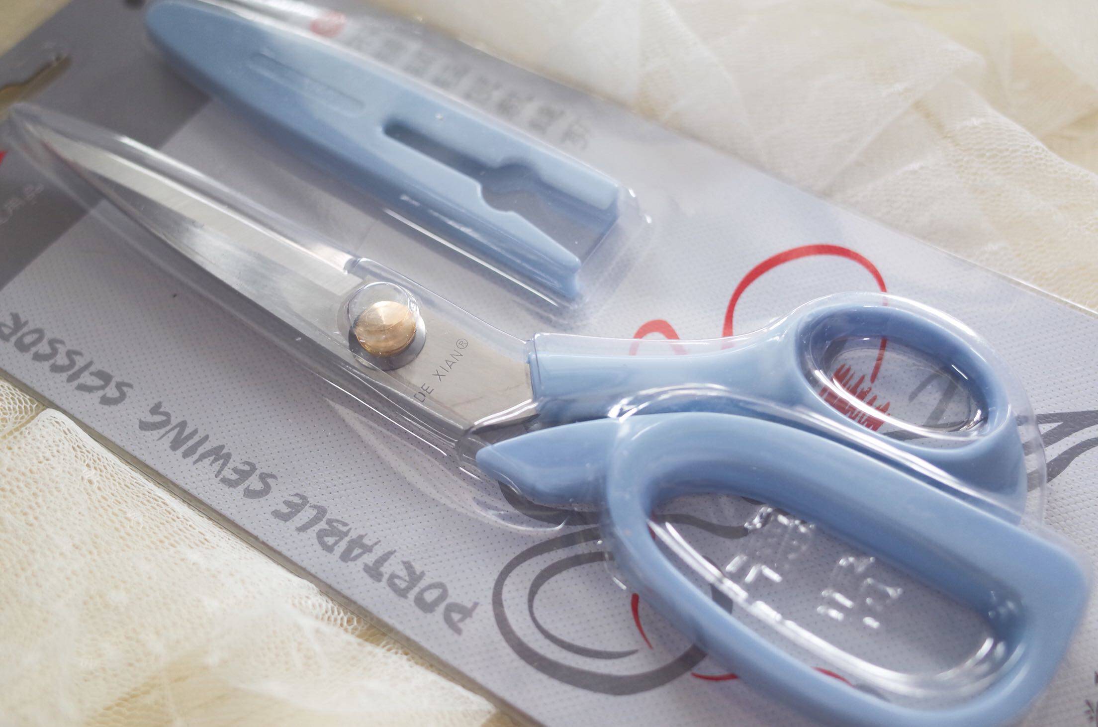 A pair of lightweight 8-inch stainless steel tailor scissors with plastic protective cover weighing about 81g