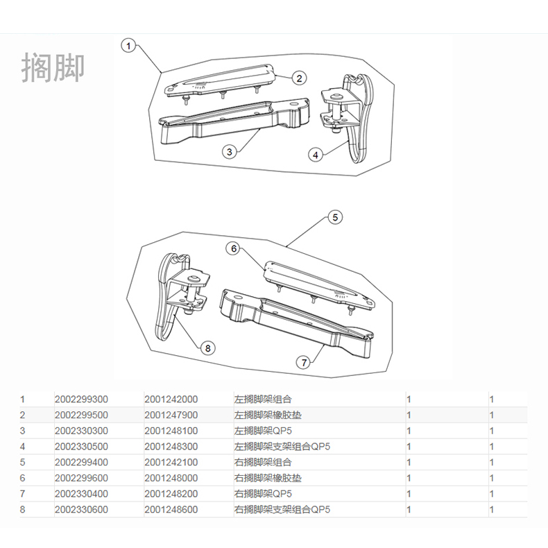 1-left footrest combination 2-left footrest rubber cushion 3-left rest foot rest QP55-right footrest combination 6-right footrest rubber cushion 7-right foot rest QP5 left foot rest combination