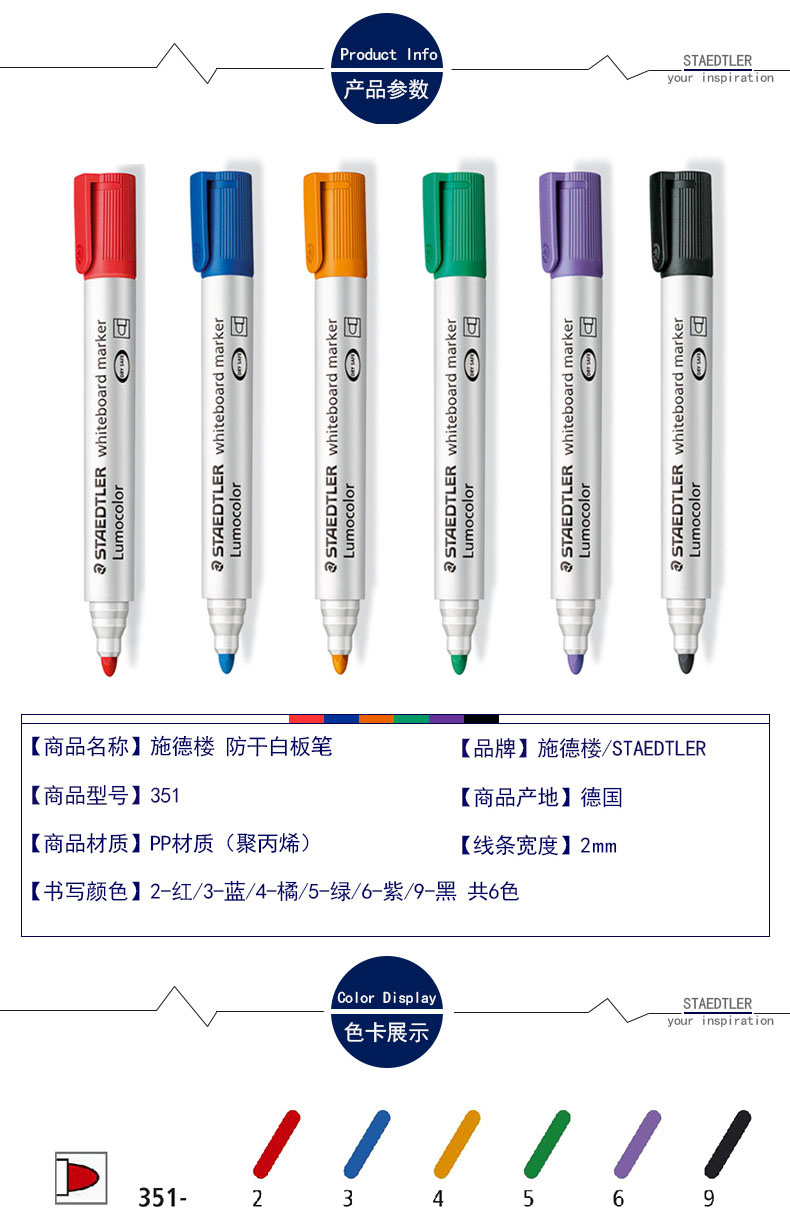 STAEDLER sched building 351 anti-dry white board pen black red blue green easy to rub 6-color suit office