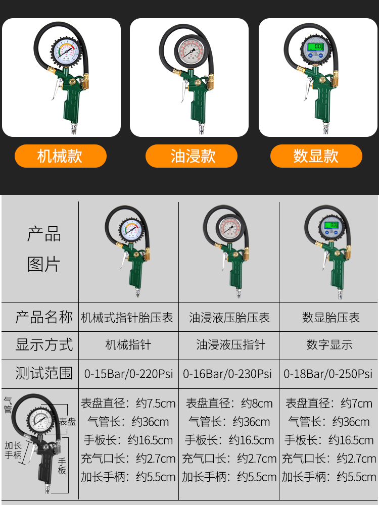 Pointer tire pressure gauge (air nozzle cap 4) Oil-immersed tire pressure gauge(air nozzle cap 4) LED digital tire pressure gauge(air nozzle cap 4)