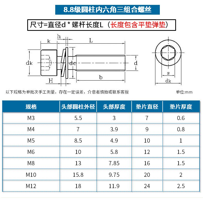 8 8 8 Class galvanized inner hexagonal triple-combined cylindrical head screw with flat gasket m3m4m5m6m8m10m12L-Taobao