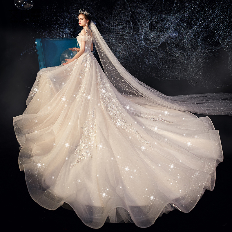 French light wedding dress 202021 new female little man bride trailing tail Forest department super fairy Hepburn thin starry sky dream