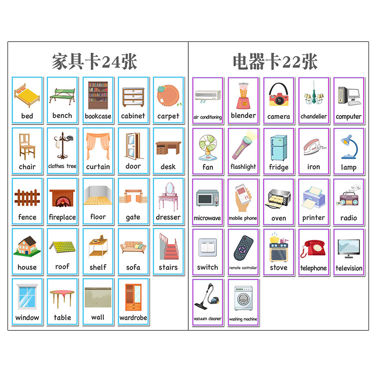 Plastic English flash card furniture electrical life goods category Waterproof and durable teacher word card color tutorial teacher