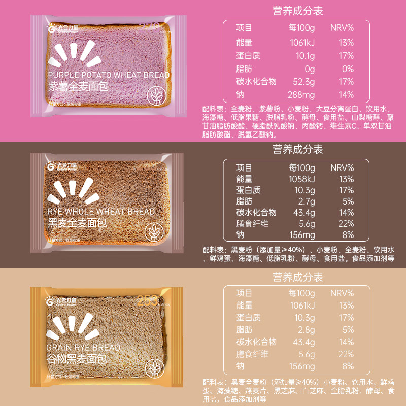 Purple potato whole wheat bread slices Fitness meal replacement Skim 0 Low-fat whole grains Saturated snacks Non-sugar-free breakfast toast