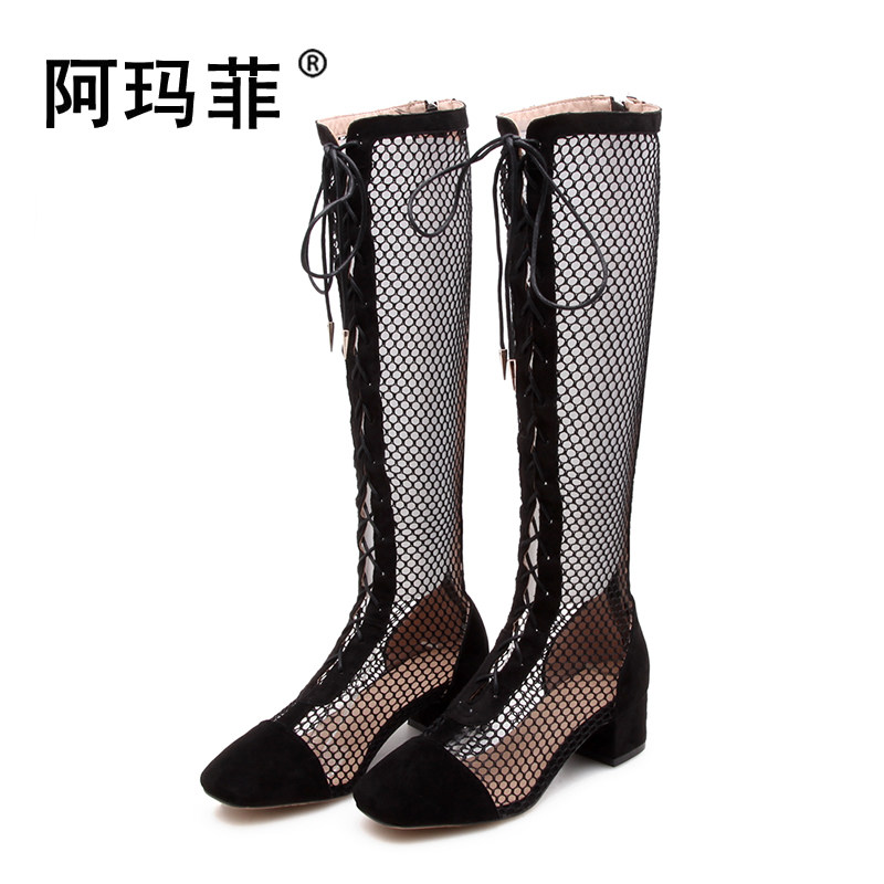 2022 spring new women's shoes thick heel leather hollow mesh sandals breathable mesh boots summer long tube thin boots